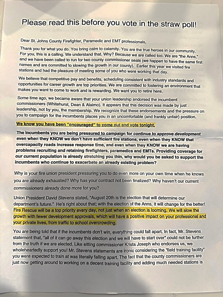 Two challenger candidates made the unfortunate decision to hand out a letter to some in attendance. The letter was addressed to St Johns County Firefighter, Paramedic and EMT professionals. In the letter (scroll to the bottom to read the letter), they said that the fire union president has been pressuring firefighters to vote for the incumbent Commissioners and stated that the decision of the Firefighters Union to endorse the sitting commissioners was made by Union leadership, not union members.