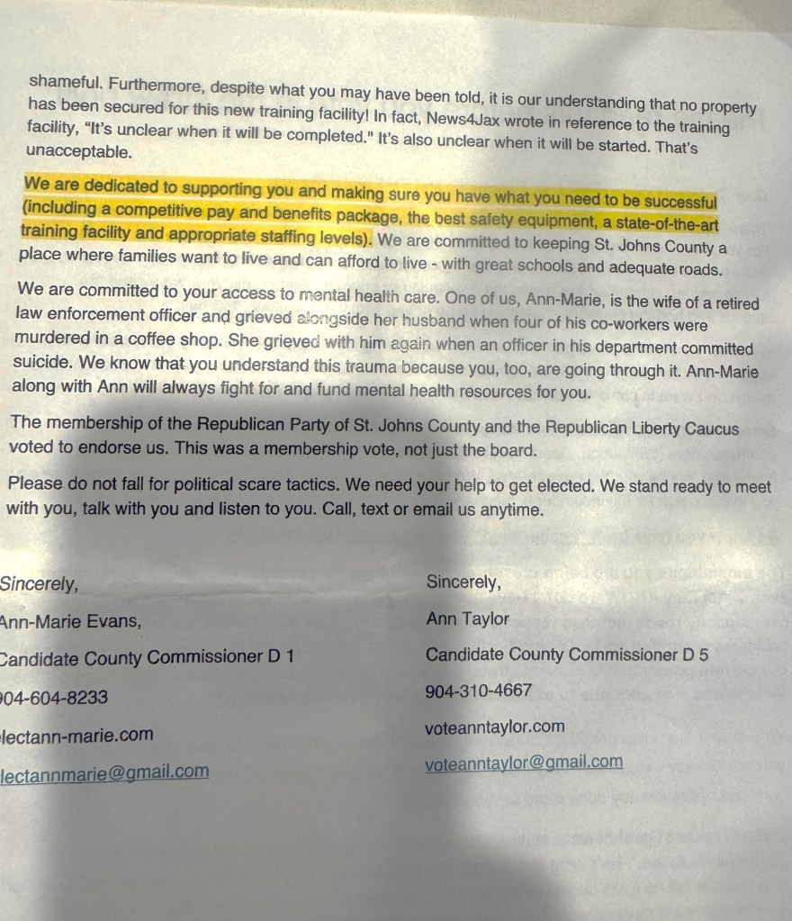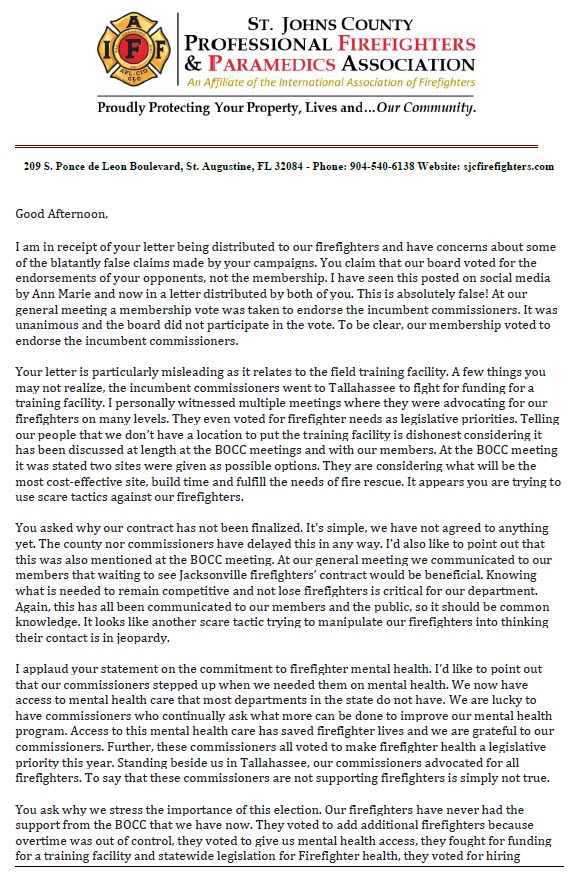 Today, David Stevens, President of the St Johns County Professional Firefighters Association, released a letter in response to their letter. In his response, he indicated that the vote to endorse the incumbent commissioners was taken by the membership, not the Board, and that the vote was unanimous to endorse the incumbent commissioners. I have also posted his letter at the bottom of this post.