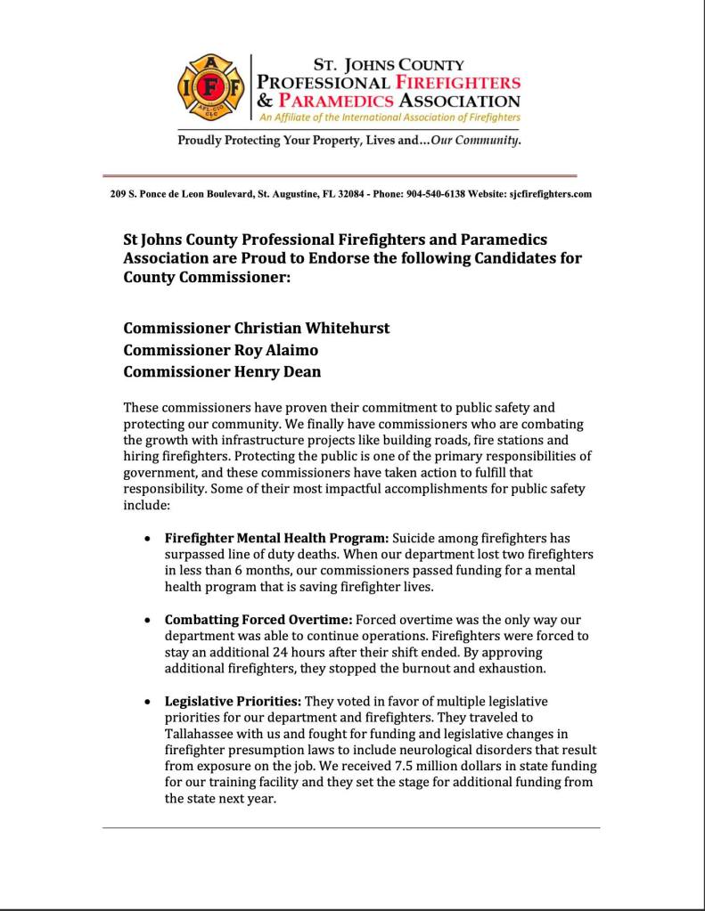 Thankfully, the St Johns County Professional Firefighters and Paramedics Association has publicly endorsed three incumbent commissioners in their bid for re-election. In that letter of endorsement, [scroll down to read the letter in its entirety] they said, “We finally have commissioners who are combating the growth with infrastructure projects like building roads, fire stations and hiring firefighters.” They go on to enumerate seven accomplishments for public safety.