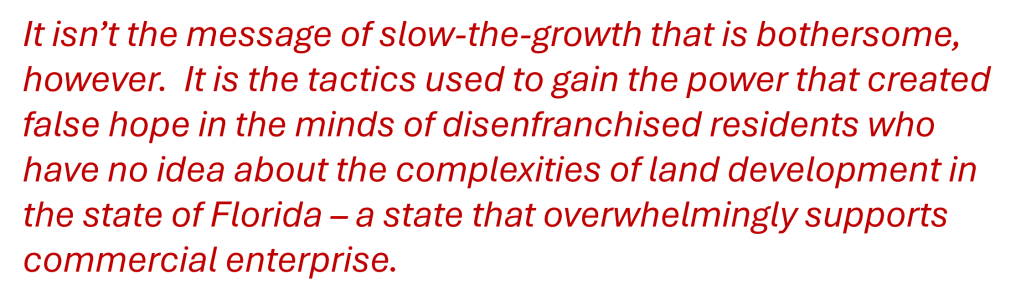 And so, the question remains – will this “slow-the-growth” Board of County Commissioners put St Johns County in legal jeopardy as they fight the developer community? Let’s not forget, Florida law looks kindly on land developers.